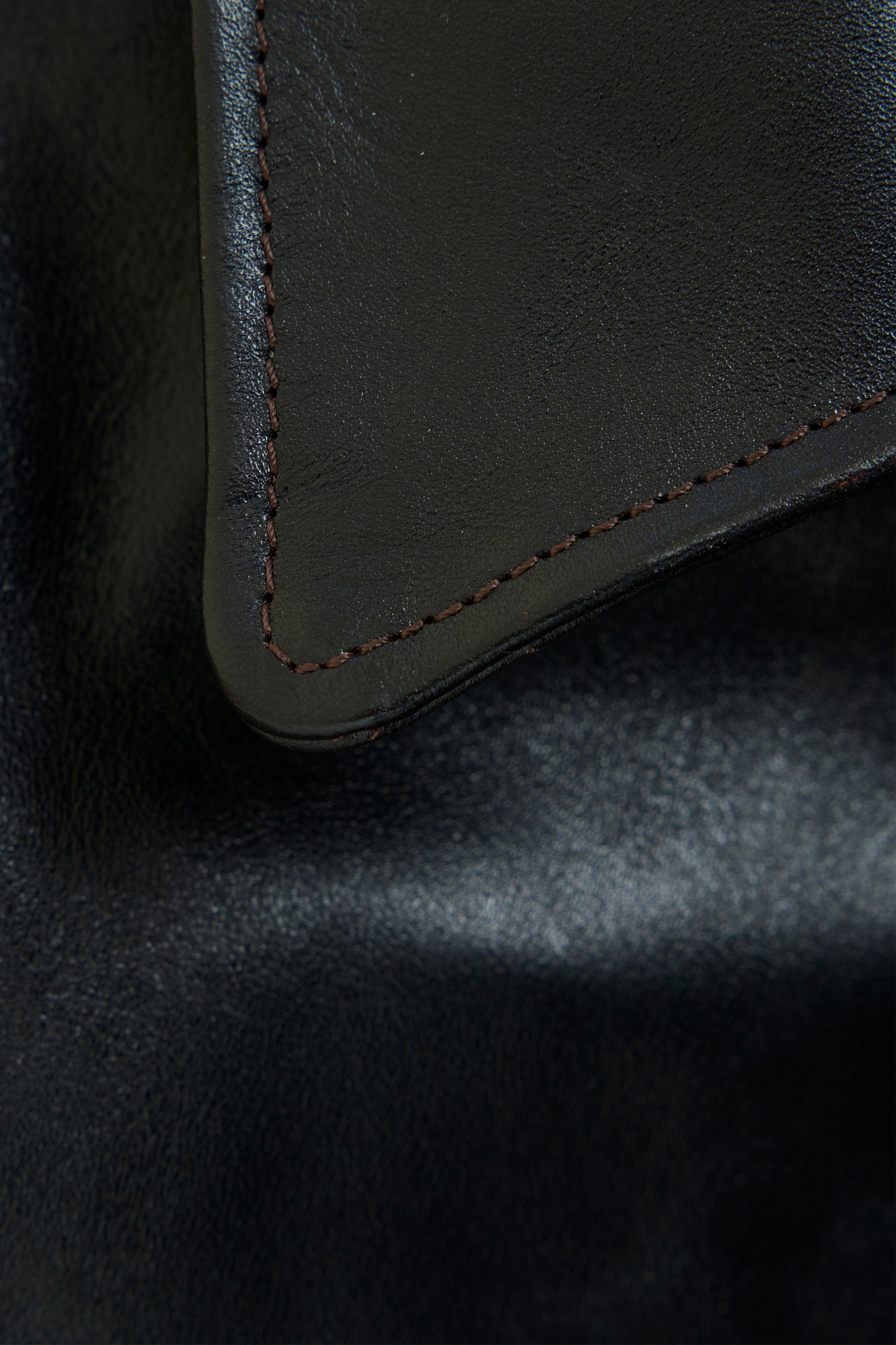 The tea-core horsehide is rich and weighty at first, but it softens with wear and gradually reveals lighter tones underneath. It’s the kind of leather that tells a story the longer you keep it in rotation. Add in little touches like the gem-shaped Waldes zipper pull, brass adjusters, and buffalo horn button cuffs, and you’ve got a piece that nails the details without overdoing it.