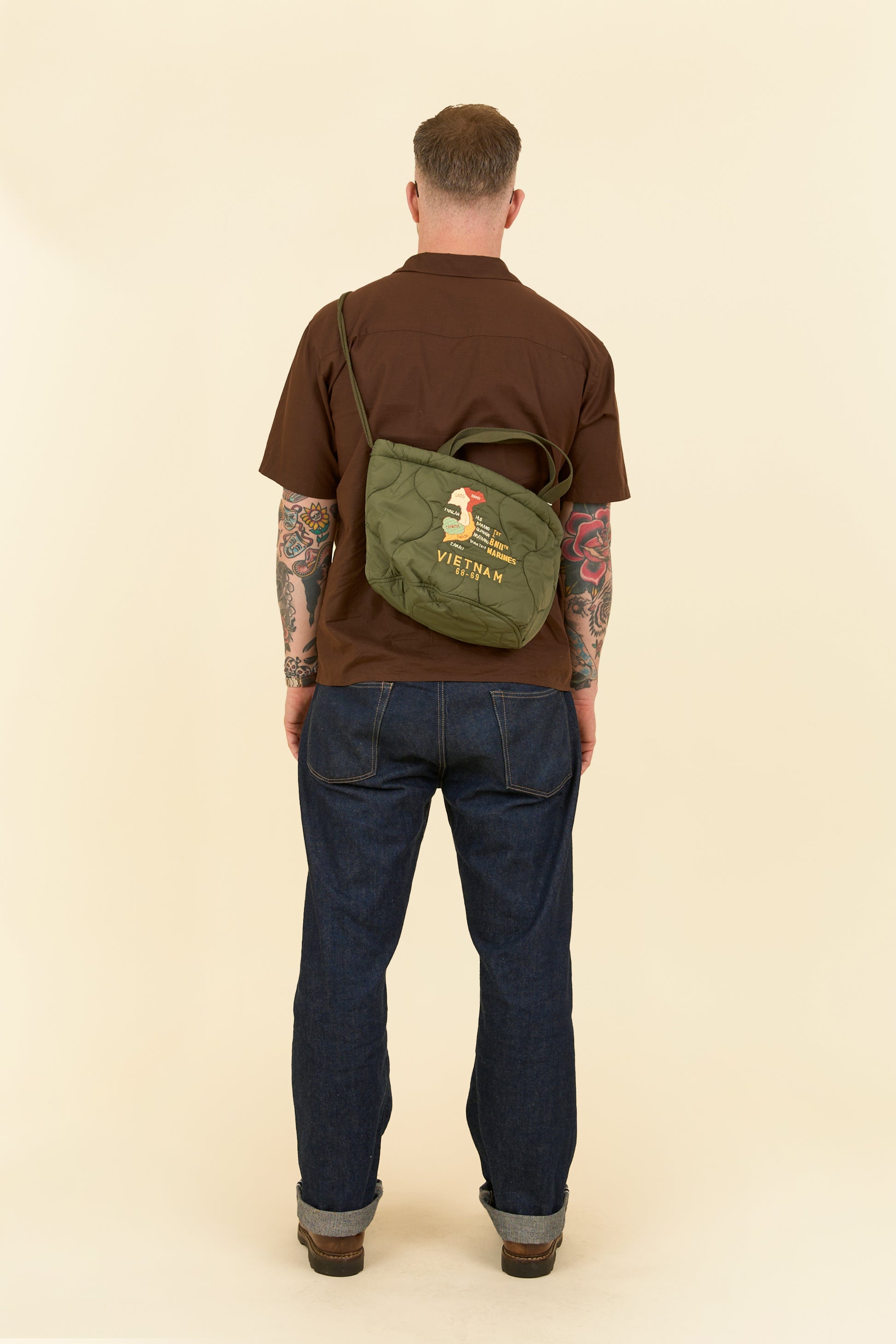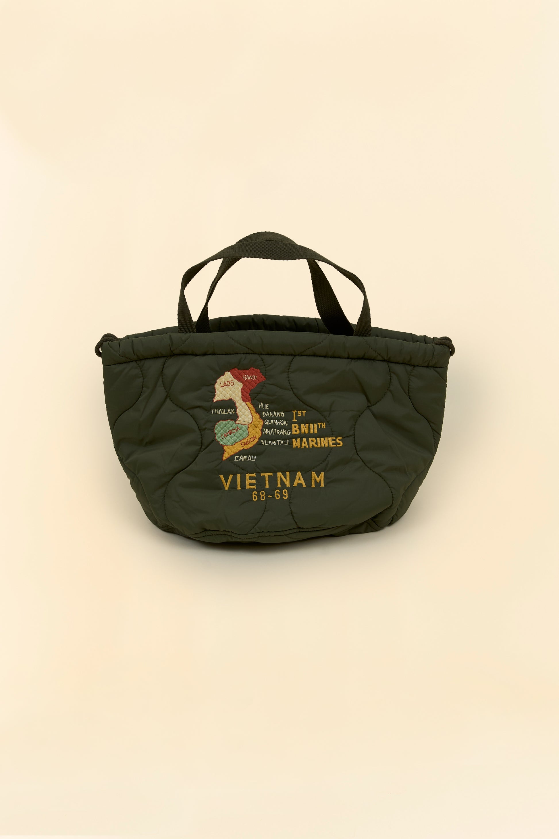 A compact padded bag inspired by Vietnam War souvenir jackets. Made from quilted polyester with detailed embroidery, it’s designed to hold everyday essentials while staying lightweight and practical.