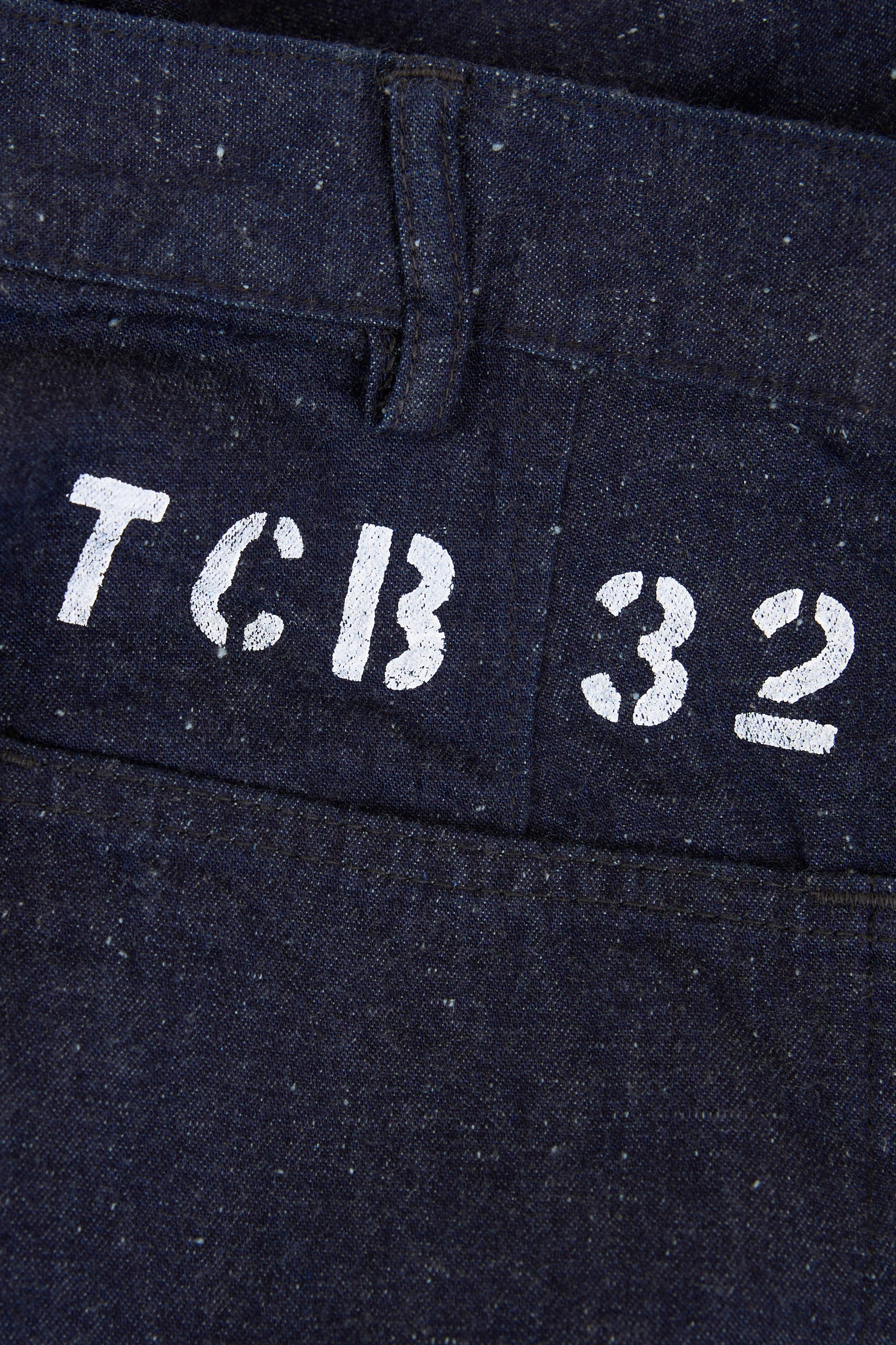 Inspired by 1940s US Navy deck trousers, the TCB Jeans Seamens Trousers blend vintage naval workwear with everyday comfort. Made in Kojima, Okayama from 10oz neppy Japanese denim, the fabric is woven on vintage looms using 100% cotton for a soft yet durable feel. Grey-dyed warps create distinctive fades over time, while double-stitched pockets, custom urea resin buttons, and a handworked stencil reflect TCB’s attention to detail. A faithful 1940s-inspired reproduction, proudly made in Japan.