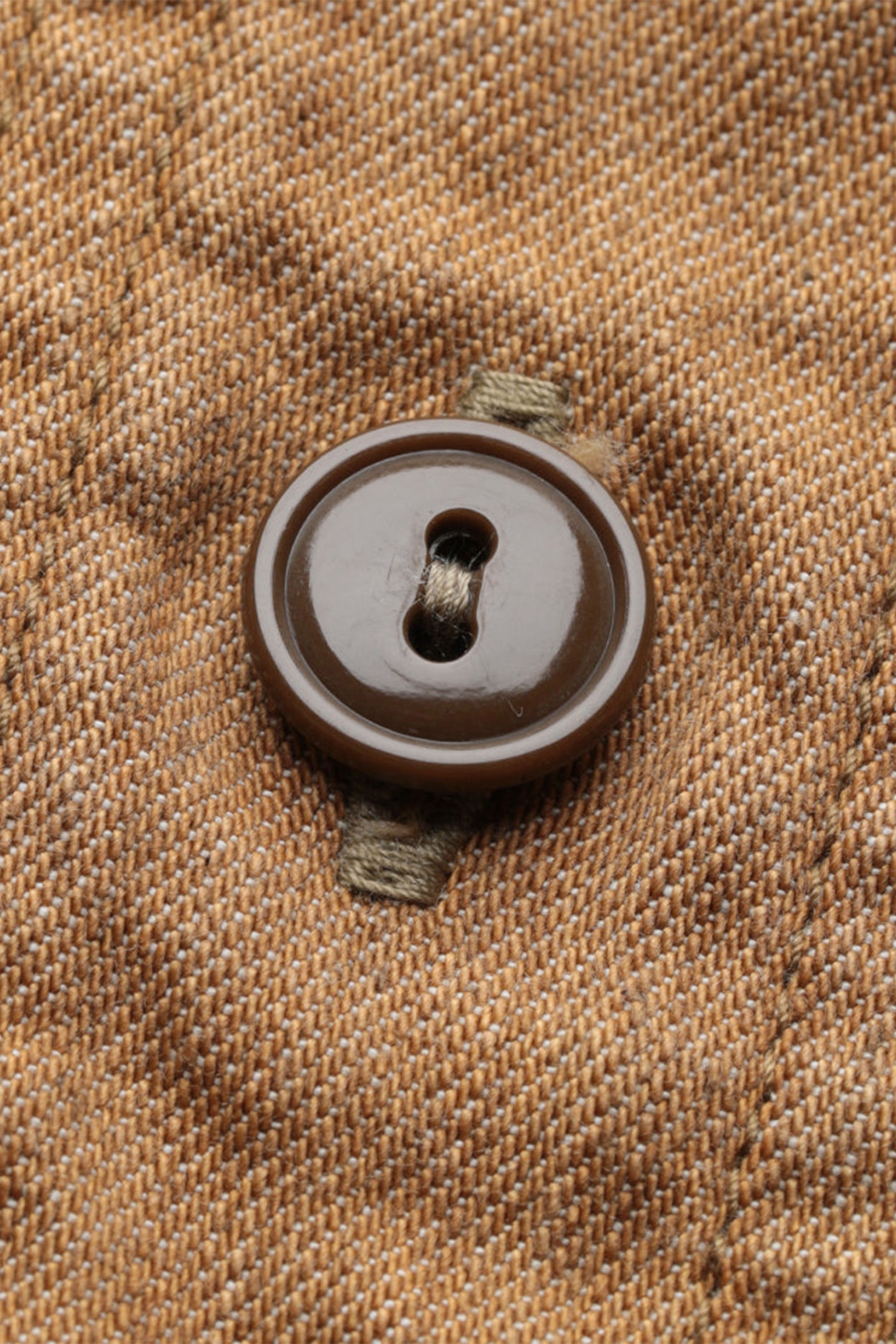 This short-length, blouse-style jacket combines a relaxed, boxy fit with functional details like a chin strap collar, two-piece sleeves, and reinforced stitching for durability. Made from lightweight 8oz brown sulphur-dyed denim, it balances practical workwear functionality with timeless style.