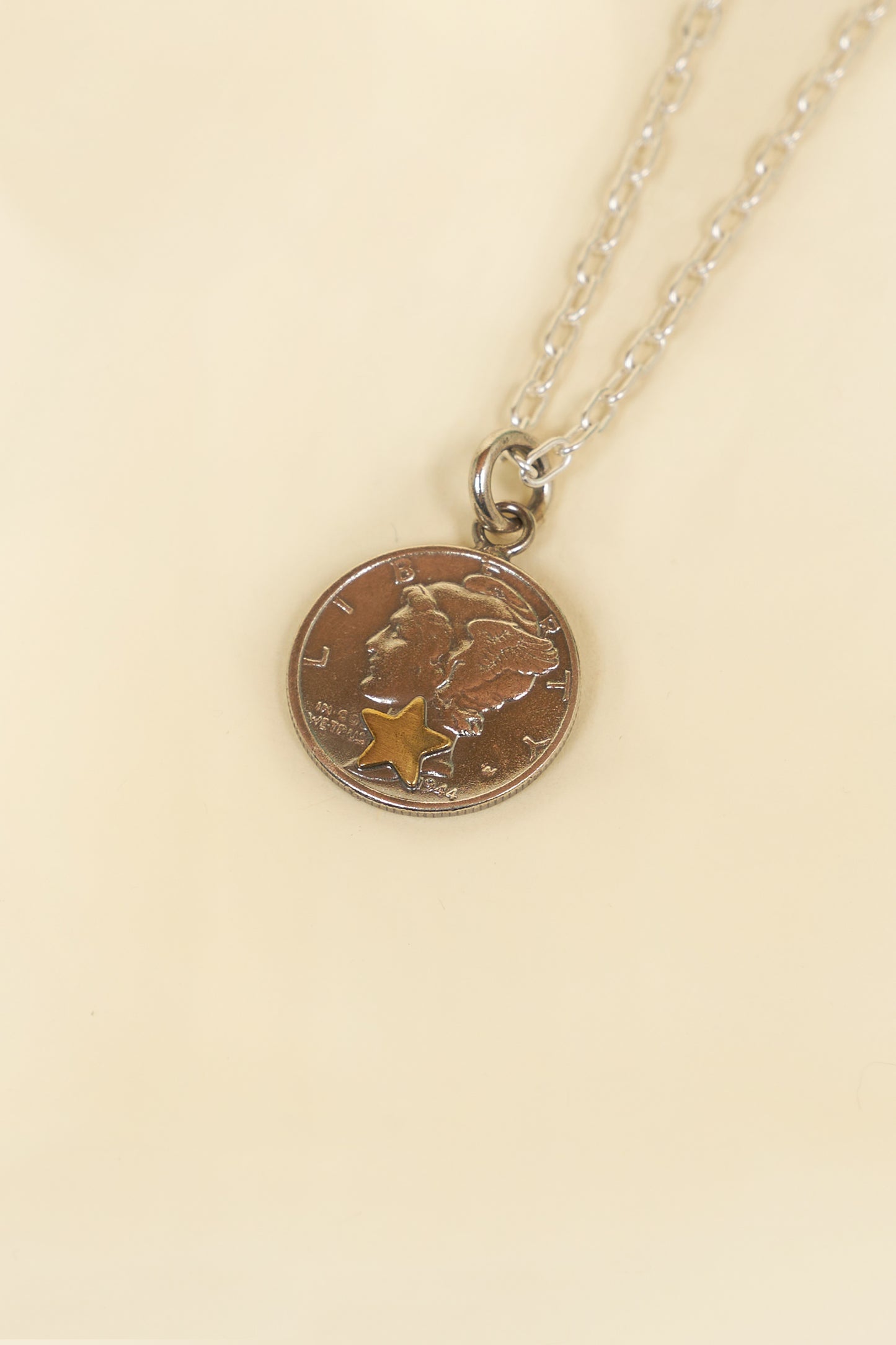 This Button Works necklace is made from an original Mercury dime coin, which features a stunning design that was produced from 1916 to 1945. Each coin is carefully polished and mounted on a brass star accent, adding an elegant touch to the overall piece. As you wear the necklace, the brass parts will develop a familiar patina, creating a unique look over time.