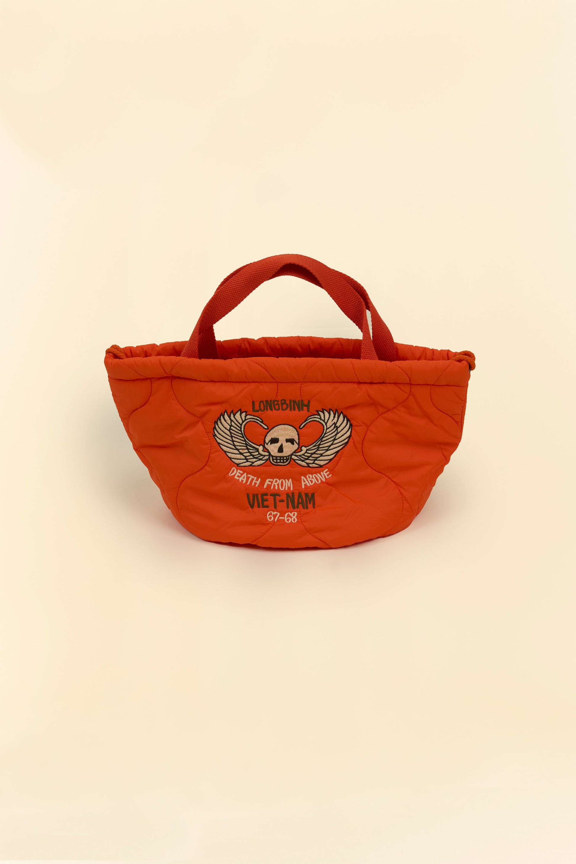 A compact padded bag inspired by Vietnam War souvenir jackets. Made from quilted polyester with detailed embroidery, it’s designed to hold everyday essentials while staying lightweight and practical.