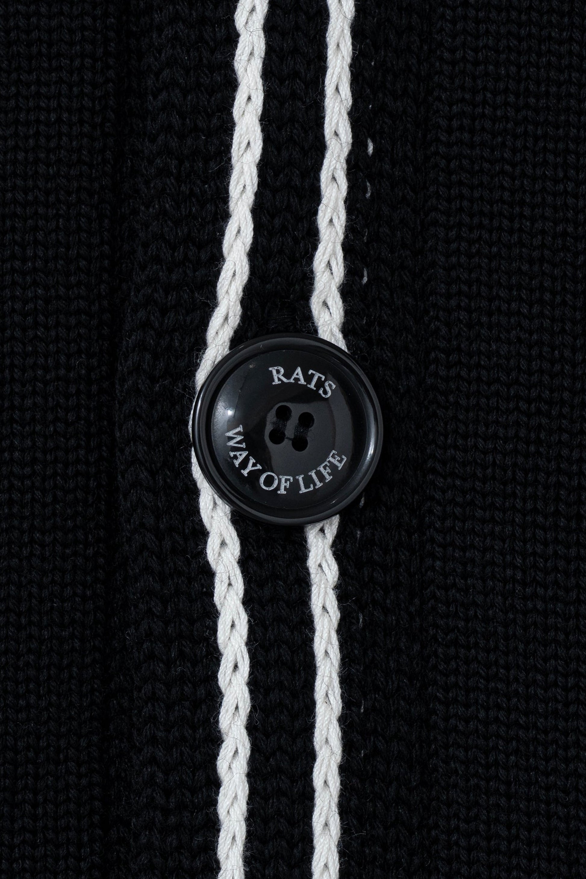 Inlay stitch construction at the placket and pocket openings references 1950s design, while custom “RATS WAY OF LIFE” buttons add a distinctive touch. Finished with a slightly fitted silhouette and clean side pockets, this cardigan offers both warmth and structure, making it a timeless layering piece with quiet character.