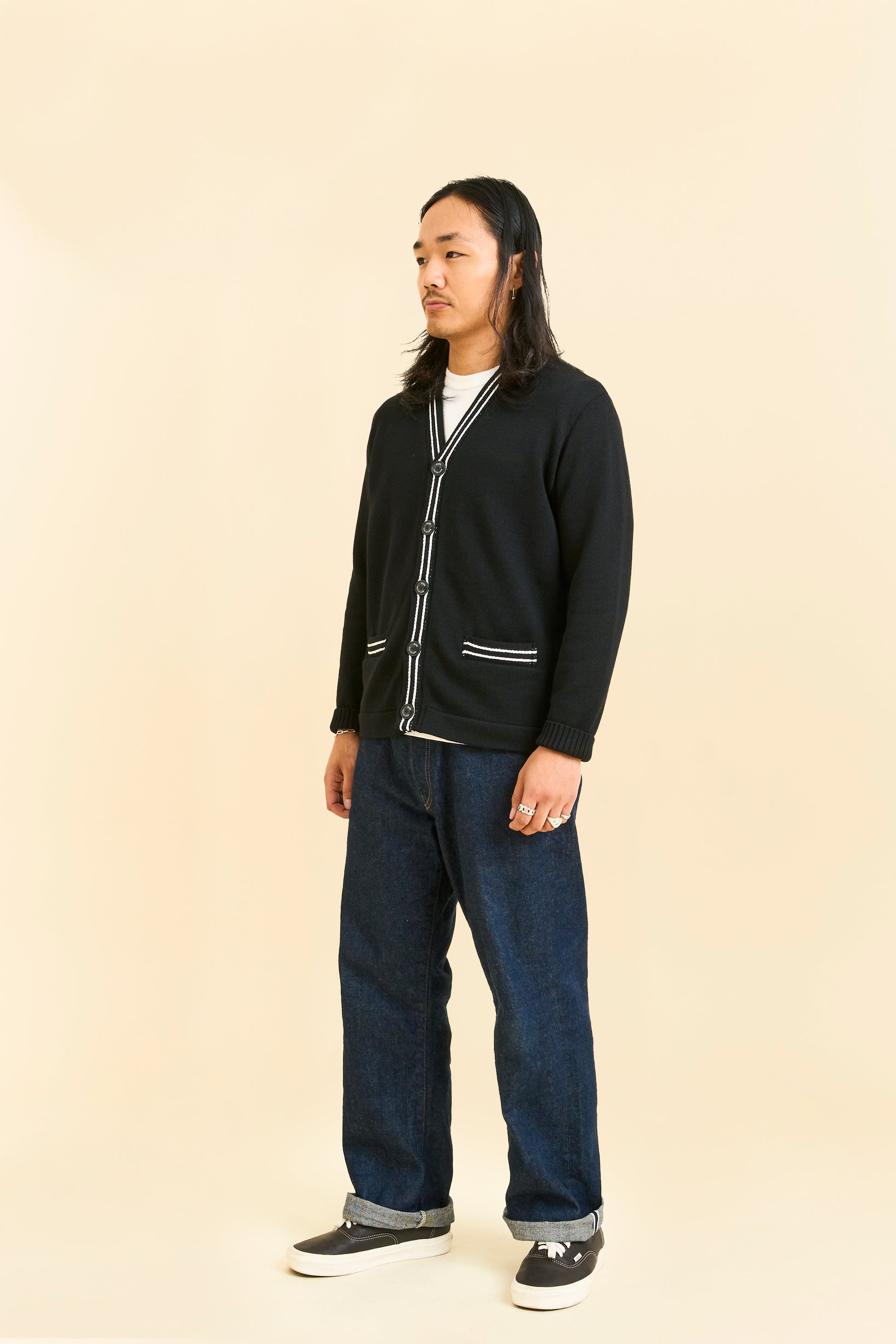The RATS Black Cardigan combines mid-century inspiration with refined Japanese craftsmanship. Knitted entirely from wool, the body uses double the yarn for a substantial weight and rich texture.